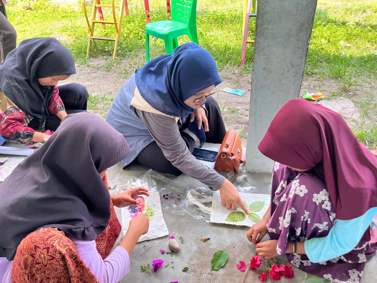 Melalui kegiatan ini, anak-anak diajak memanfaatkan tumbuhan segar di sekitar mereka sebagai media seni ramah lingkungan.