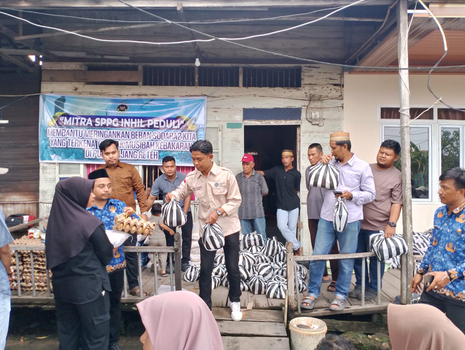Bantuan diserahkan secara simbolis kemudian selesai nya rangakain acara baru kemudian diserahkan kepada korban kebakaran oleh mitra SPPG kepada 61 kepala keluarga terdampak kebakaran.