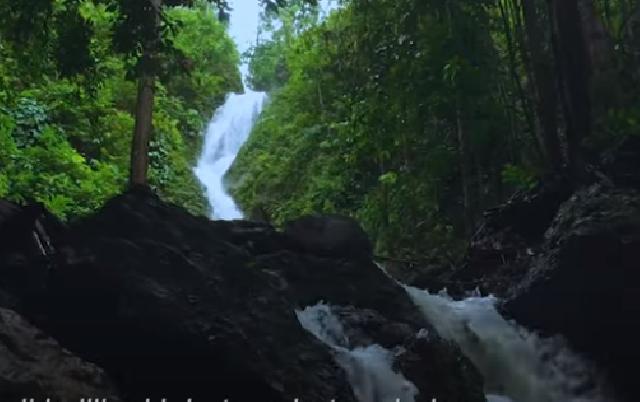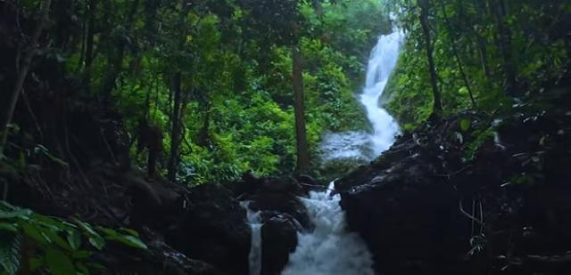 Dengan batuan yang berlumut dan tanaman hijau dikiri kanan tebing membentuk aliran air yang jernih jatuh ke bebatuan begitu mempesona dipandang mata.