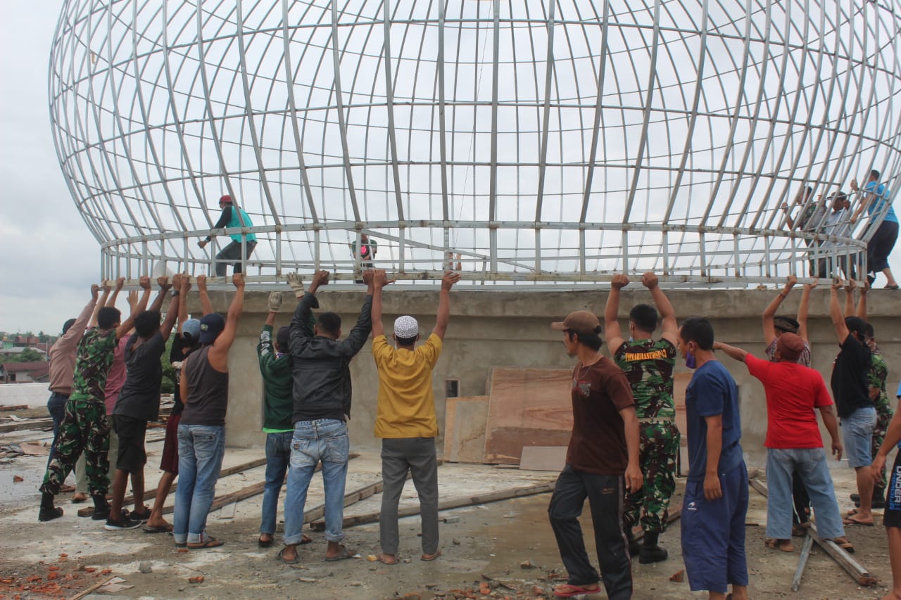 Kodim Inhil Ikut Andil Dalam Gotong Royong Pemasangan Kubah Masjid Ta'alimul Huda