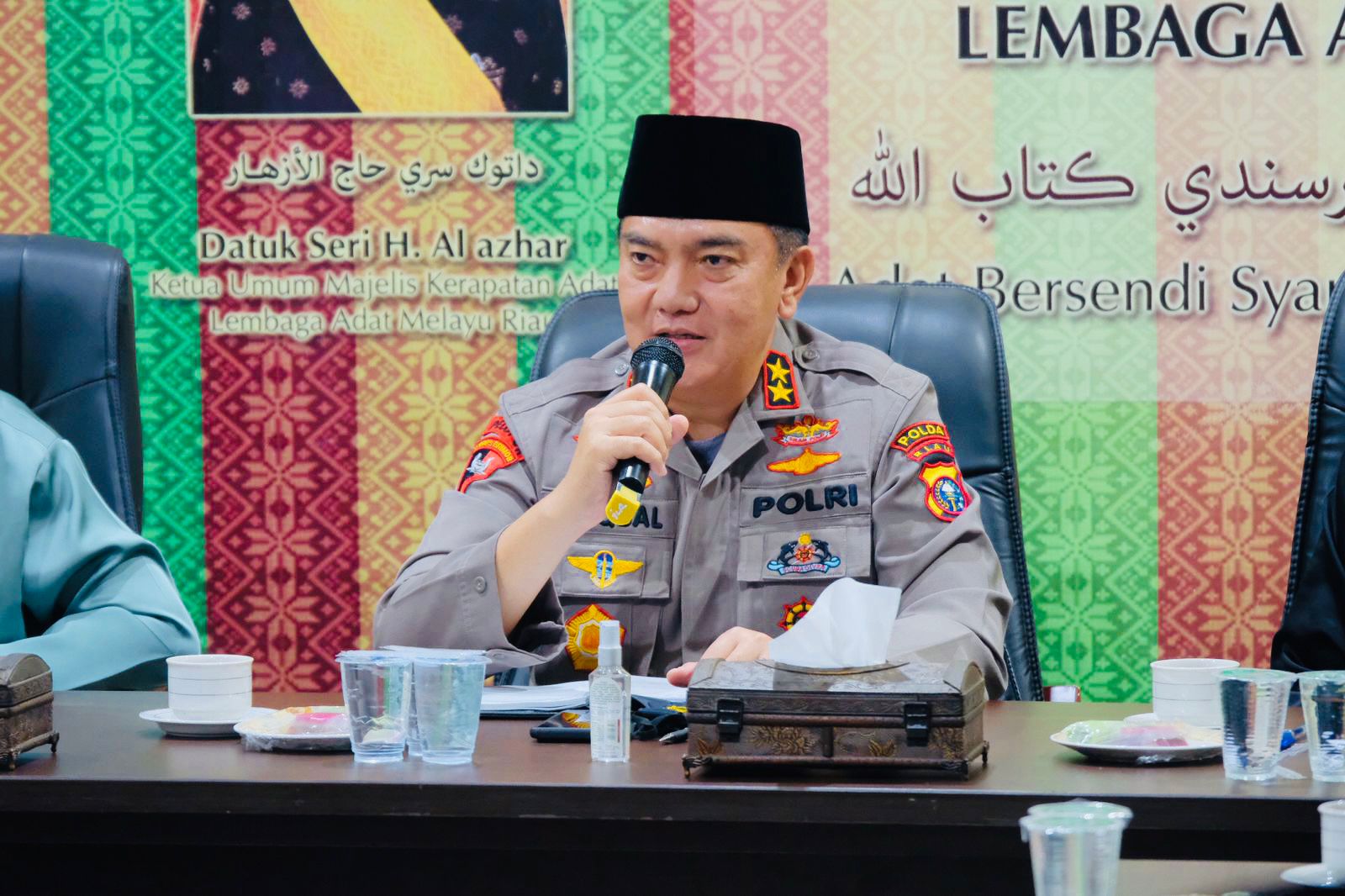“Saya ingin menyampaikan, Polda Riau dan segenap Jajarannya Insya Allah siap bekerjasama dengan Lembaga Adat Melayu Riau untuk menuntaskan semua Dinamika-dinamika yang ada dan tentunya kami mengedepankan tabayun dan menjalin komunikasi yang baik, sebab itu merupakan ciri-ciri orang Melayu,” terang Kapolda.