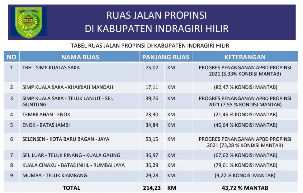 Seperti ruas jalan Kuala Saka-Mandah. Selensen-Kota Beru. Enok-Benteng. Pulau Kijang-Batas Jambi. Secara kewenangan penanganan maupun pembangunan merupakan kewenangan Provinsi Riau dan adapun pembiayaan sebagian Kegiatan tersebut menggunakan Multi years.