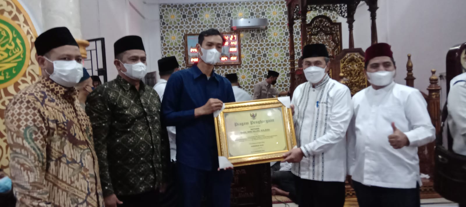 Melalui giat Safari Ramadan Gubernur Riau, Drs H Syamsuar MSi, secara simbolis diserahkan kartu perlindungan untuk imam dan penjaga masjid (marbot), Kamis (7/4/2022) di Masjid Al-Muttaqin, Jalan Lintas Pangkalan Kerinci.