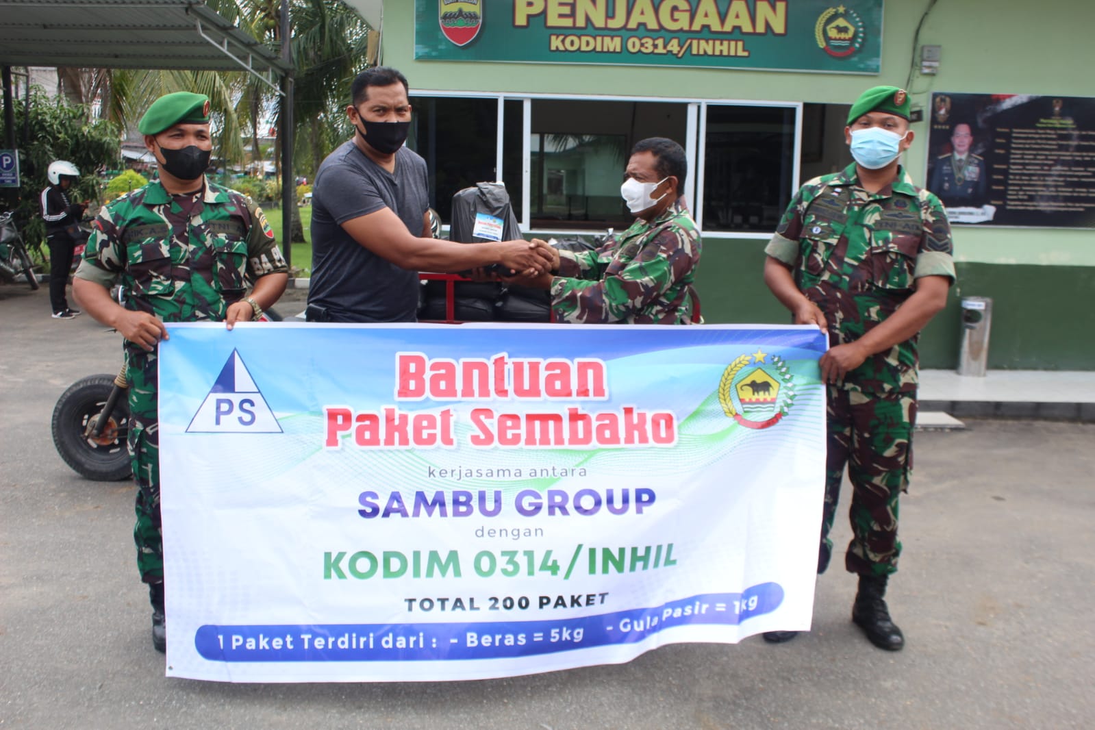 Bantuan paket sembako ini diserahkan secara simbolis oleh Ribut Suhardi sebagai perwakilan Humas PT Sambu wilayah kota Tembilahan dan di terima langsung Dandim 0314/lnhil Letkol Arh M Nahruddin Roshid, S.E.,M.Tr. (Han) yang diwakili Pasi Ops Kodim 0314/lnhil Kapten lnf Tarmizi.