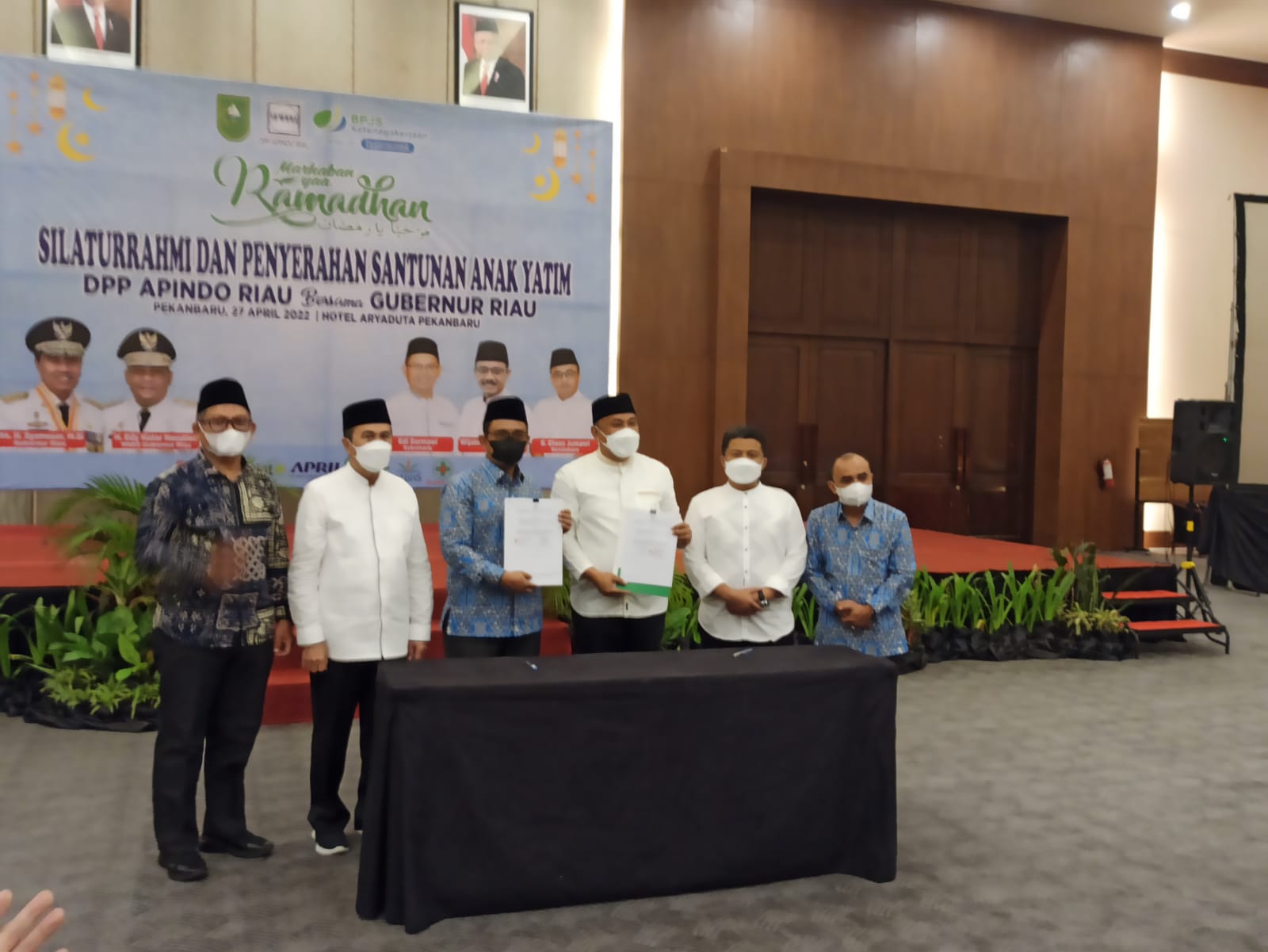 Penandatanganan MoU dilakukan oleh Deputi Direktur BPJS Ketenagakerjaan Wilayah Sumbarriau, Eko Yuyulianda dengan Ketua DPP APINDO Provinsi Riau, Wijatmoko Rah Trisno disaksikan oleh Gubernur Provinsi Riau, Drs H Syamsuar dan Kepala Dinas Tenaga Kerja Provinsi, H Imron, Rabu (28/4/22)