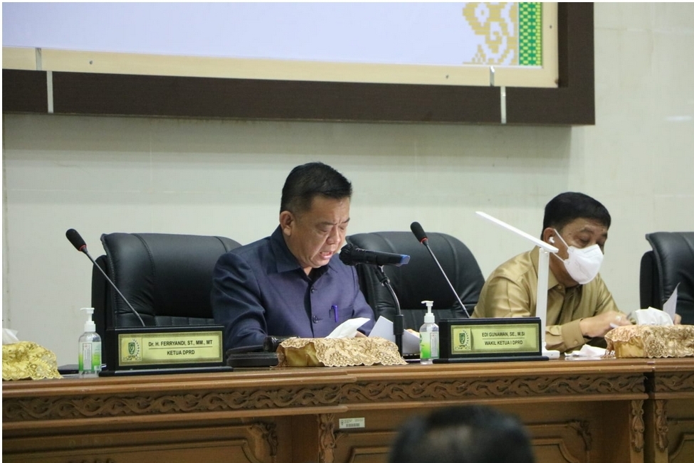Dalam rapat tersebut dipimpin oleh Wakil Ketua DPRD Edy Gunawan, SE, M.Si Disertai Ketua DPRD Dr. H. Ferryandi, ST, MT MM dan Wakil Ketua II DPRD Inhil Dr. H Mariyanto, SE, MH dan III DPRD Inhil Andi Rusli, serta Sekwan Indra Yevi Rais, S.Sos, M.Si.