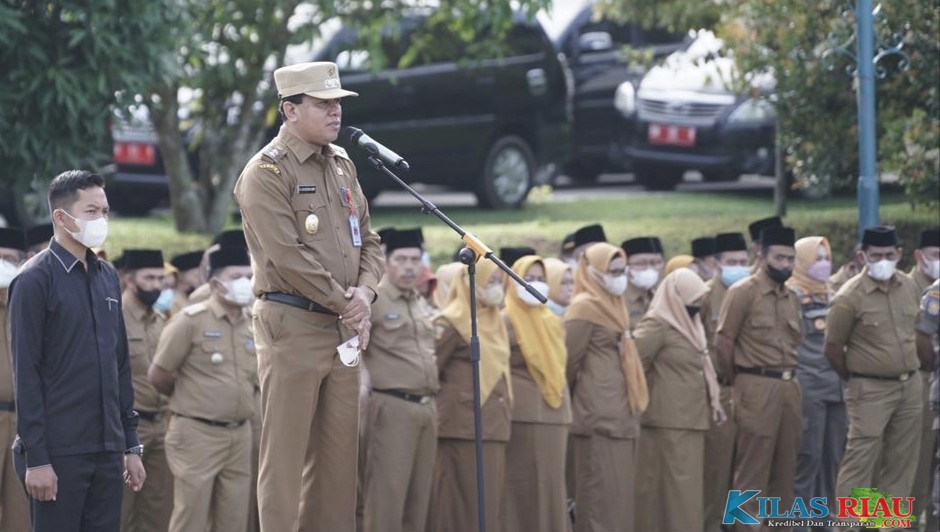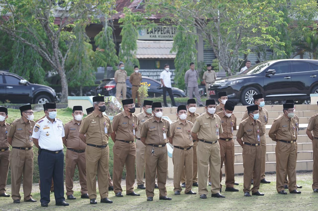 TELUK KUANTAN — Plt Bupati Kuantan Singingi Drs. H Suhardiman Amby, Ak.,MM memimpin langsung apel perdana, Senin (09/05/2022) pagi, pasca libur cuti bersama lebaran Hari Raya Idul Fitri 1443 H / 2022 M di Lapangan Upacara Kompleks Perkantoran Pemerintah Daerah (Pemda) Kabupaten Kuantan Singingi (Kuansing), Riau.