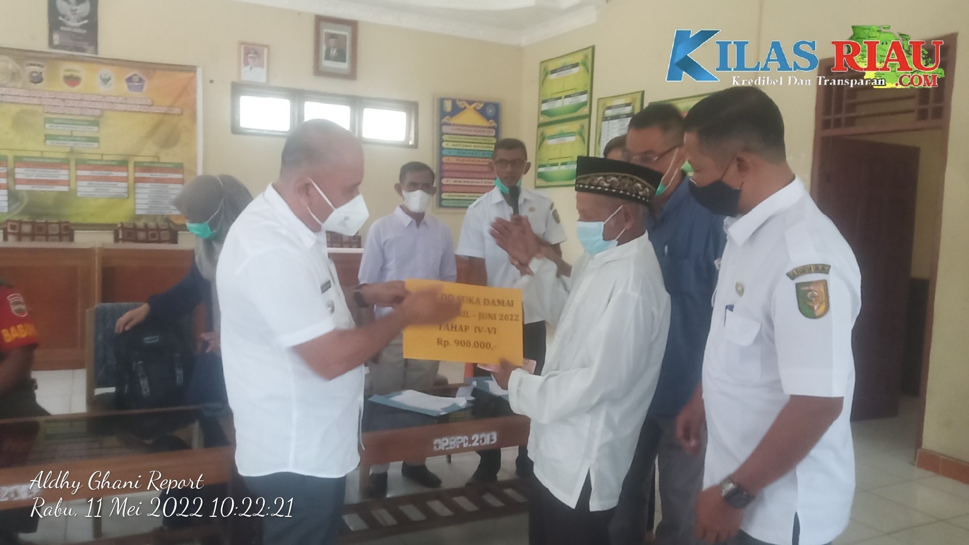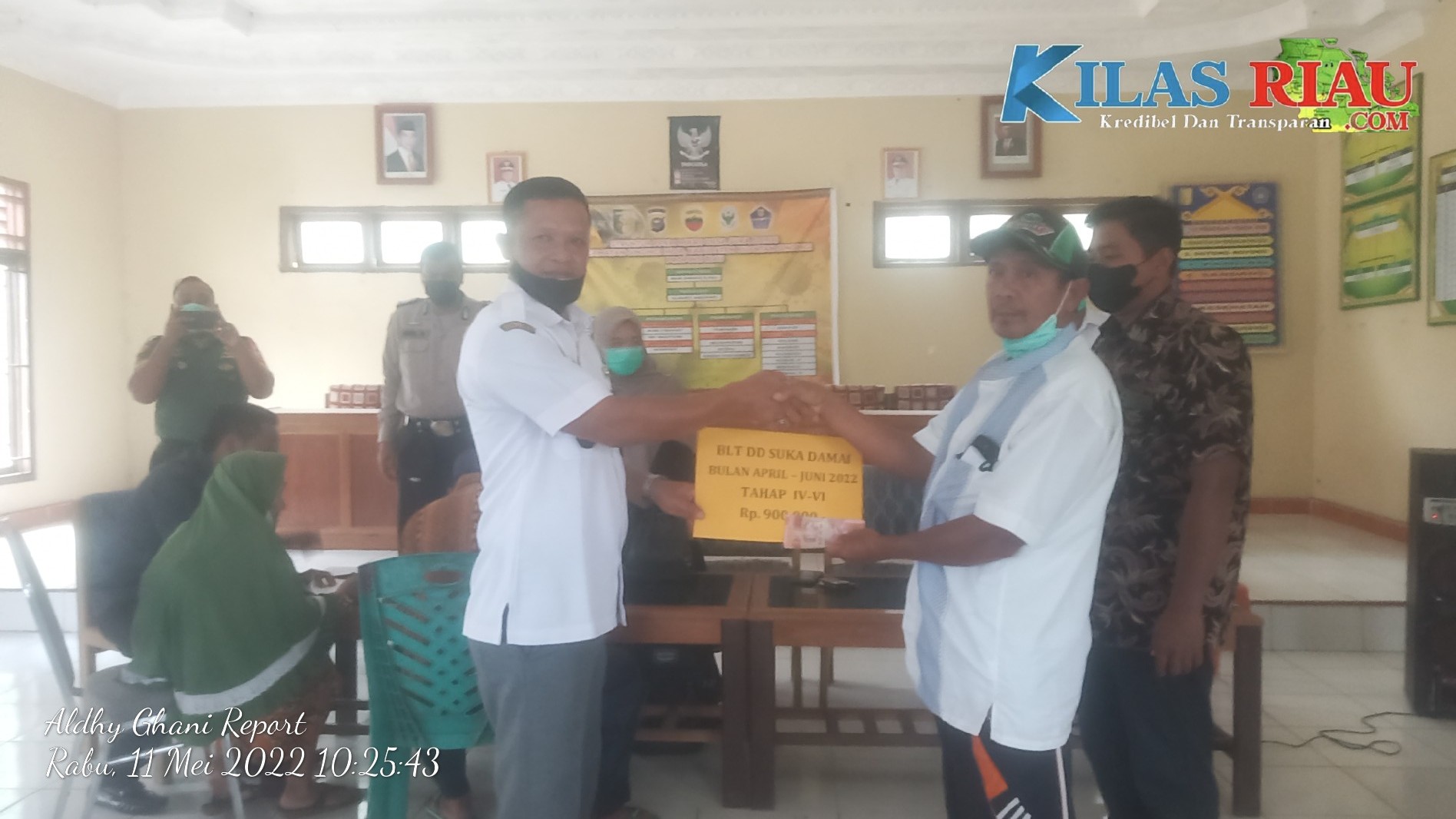 SUKA DAMAI - Pemerintah Desa (Pemdes) Suka Damai Kecamatan Singingi Hilir Kabupaten Kuantan Singingi Menyalurkan Bantuan Langsung Tunai (BLT) Dana Desa (DD) Tahap 2 Bulan April sampai dengan bulan Juni Tahun Anggaran 2022 bertempat di Aula Kantor Suka Damai, Rabu (11/05/2022).