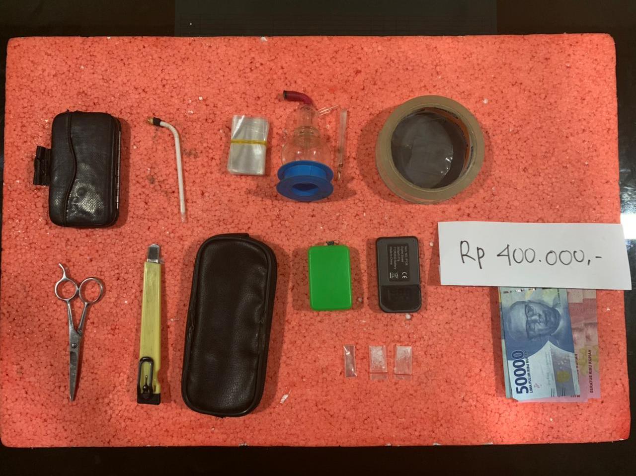 Turut pula barang bukti timbangan digital, 2 unit handphone dan uang tunai.