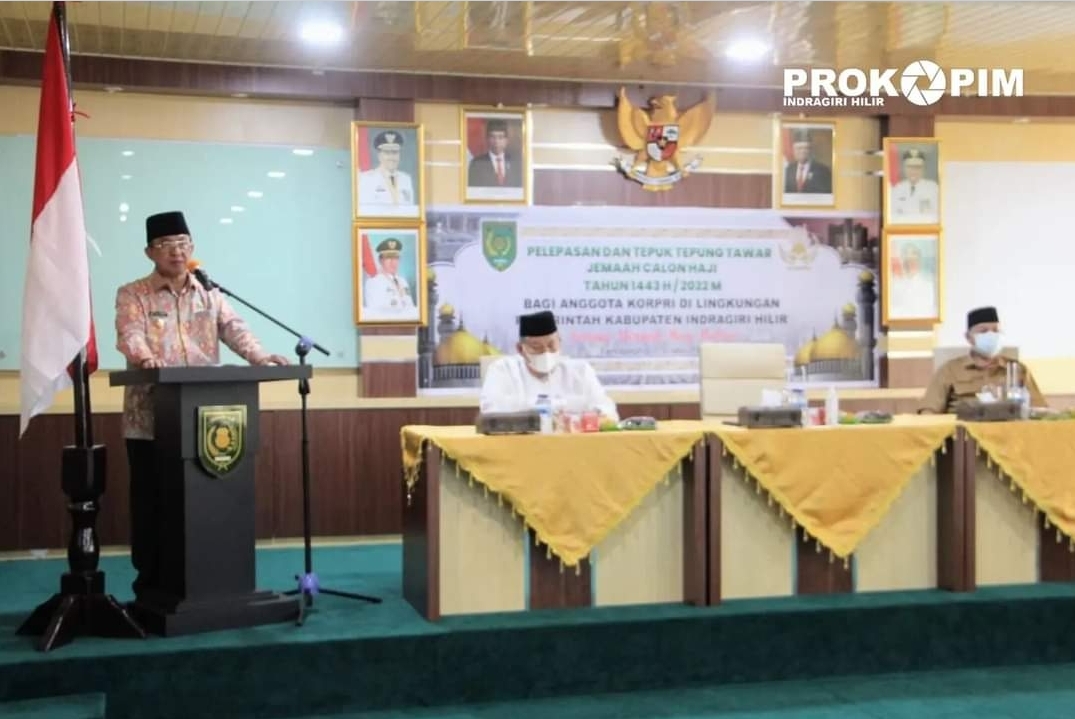 KILASRIAU.com - Bupati Indragiri Hilir Drs. H.M Wardan MP, melepas dan tepungtawari Jemaah Calon Haji (JCH) Asal Korps Pegawai Negeri Sipil Republik Indonesia (Korpri) di lingkungan Pemkab Inhil yang akan menunaikan ibadah haji pada tahun 2022, di Aula lantai 5 kantor Bupati Indragiri Hilir, Selasa (31/05/22).