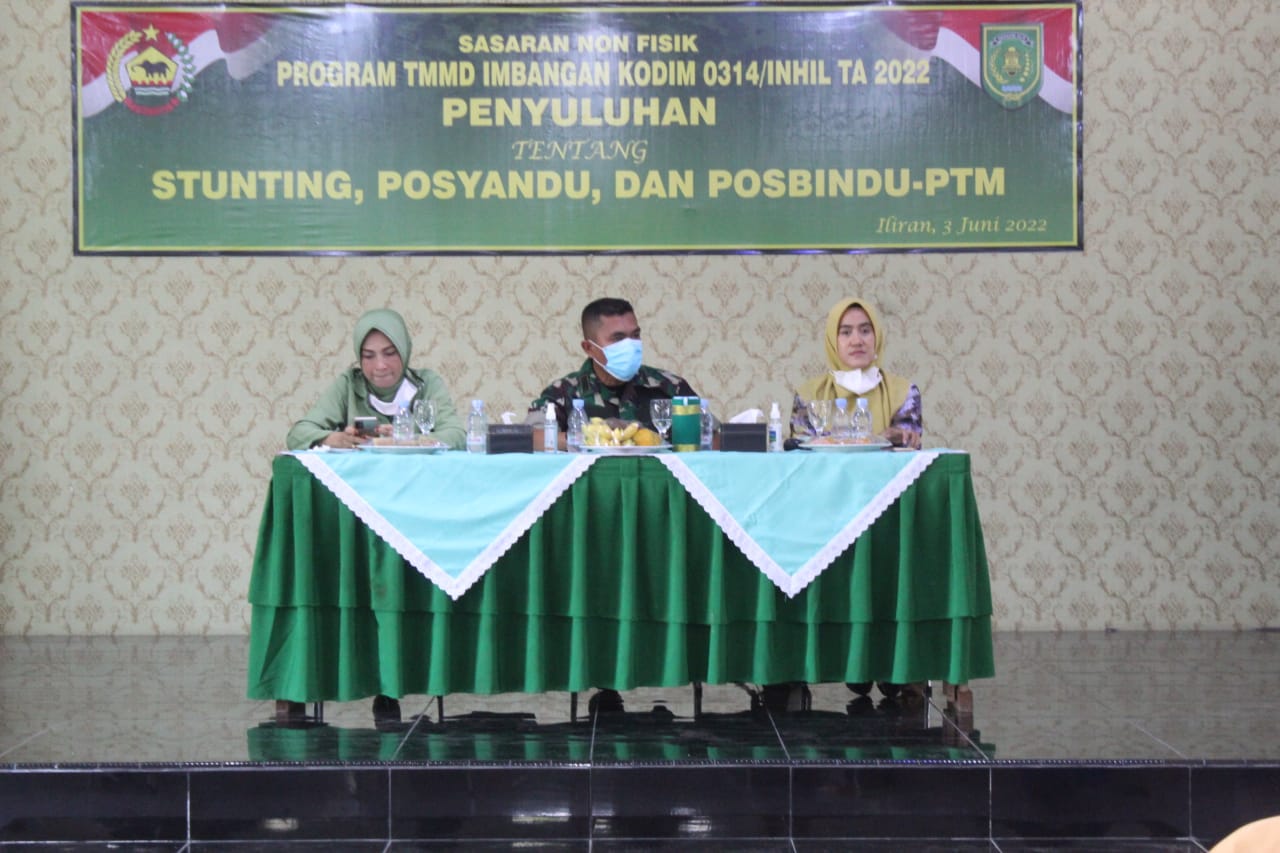 Dansatgas TMMD lmbangan Kodim 0314/lnhil Letkol Arh M. Nahruddin Roshid, S.E.,M.Tr(Han) melalui Pasi Teritorial Lettu lnf Rejekinta Ginting dalam sambutanya mengucapkan selamat datang sekaligus terimakasih kepada tim penyuluh dan peserta posyandu atas kehadirannya dalam kegiatan penyuluhan Stunting, Posyandu dan Posbindu-PTM.