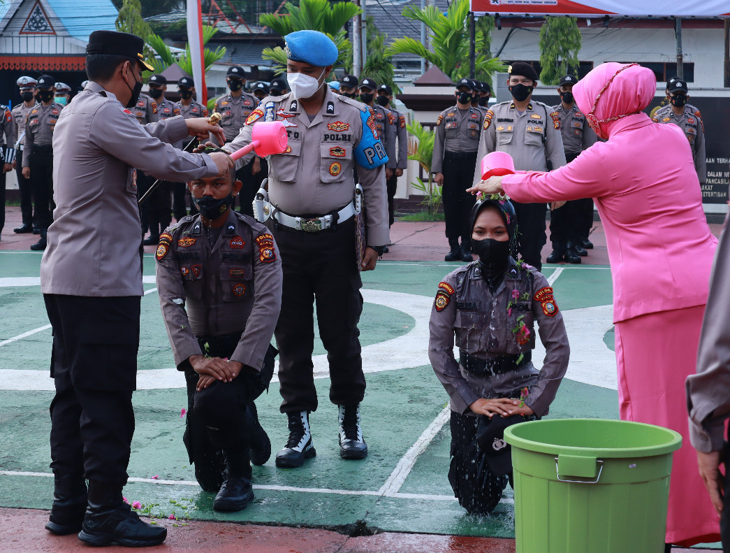 Pada rangkaian pelaksanaan upacara, Tradisi penyambutan dengan penyiraman air bunga dilakukan Kapolres Inhil serta Ketua Bhayangkari Cabang Inhil kepada perwakilan Bintara baru sebagai tanda penerimaan personel baru yang akan bertugas di Polres Inhil.