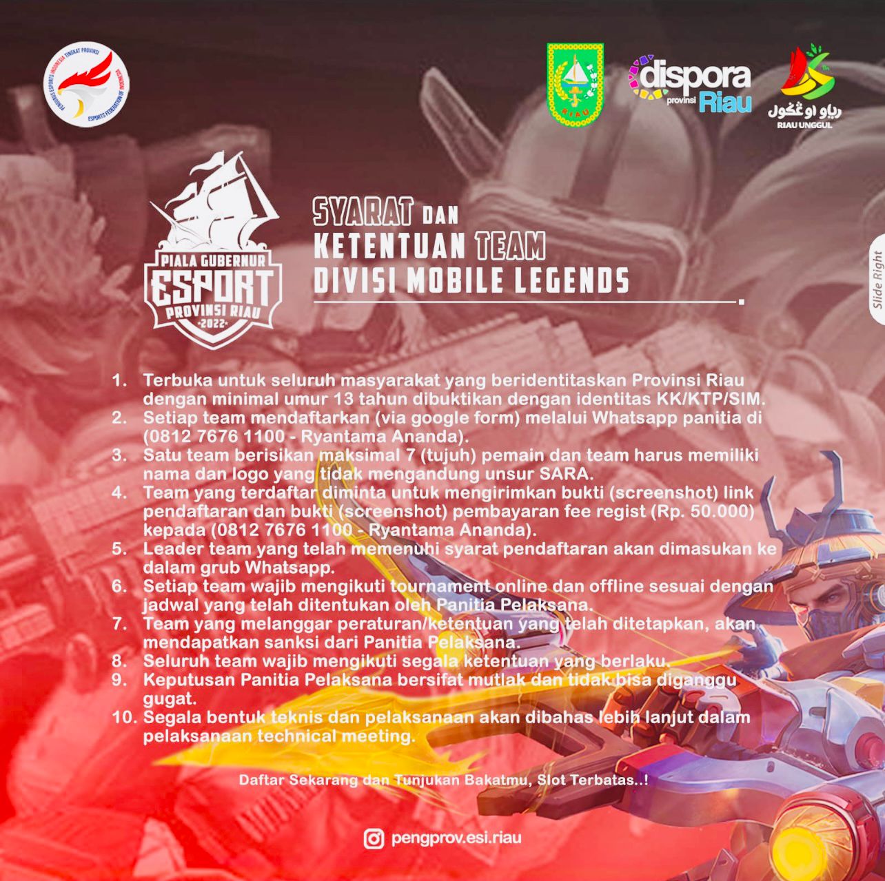 “Dalam Kejuaraan Provinsi (Kejurprov) kali ini, ESI Riau menggelar tiga game, yakni PUBG Mobile, Free Fire, Mobile Legend dengan total hadiah Rp. 30 Juta,” ungkap sigit, Jum’at malam 29 Juli 2022.