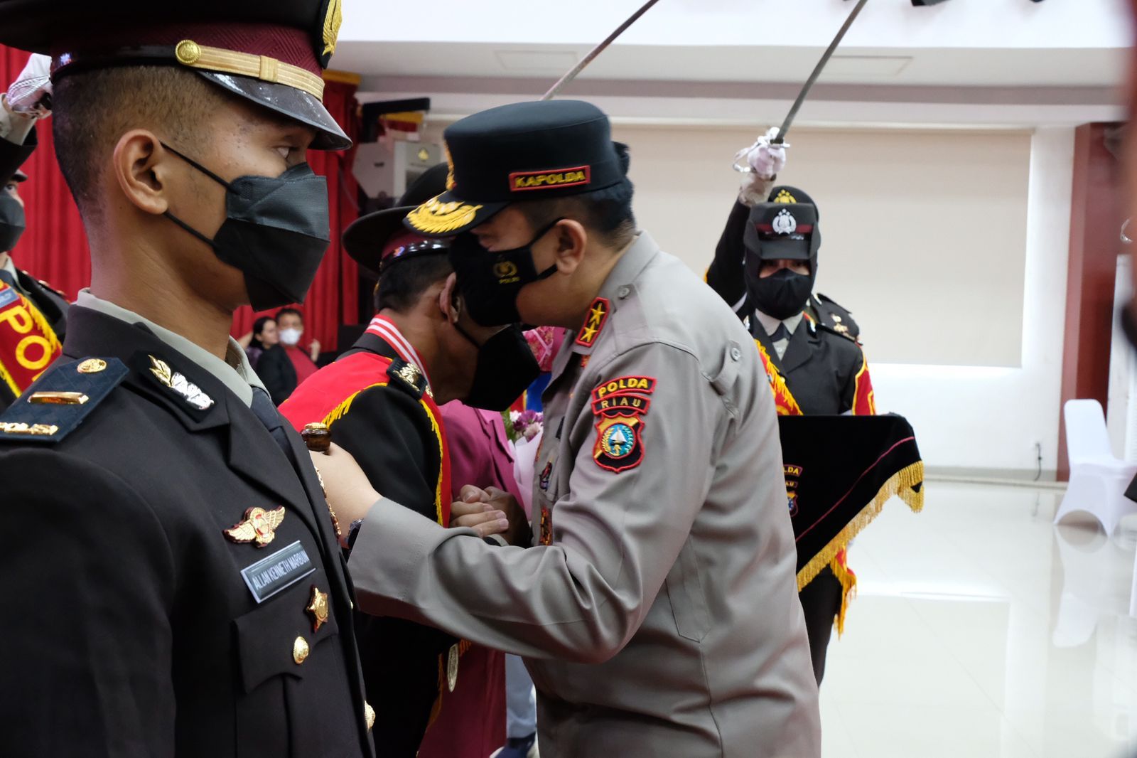 Pelepasan ditandai dengan upacara tradisi pedang pora yang digelar di aula Tribrata Mapolda. Kapolda Riau didampingi Ketua Bhayangkari Daerah Nyonya Nindya Iqbal dan ketua Purnawirawan Polri Polda Riau Kombes Pol (Purn) Drs. H. Fachruddin Bakar menyerahkan bingkisan kepada perwakilan pensiun.