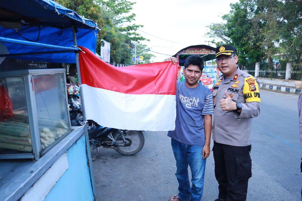 Setiap pengguna jalan yang melintas di depan Mako Polres tersebut dihentikan dan dibagikan bendera Merah Putih, agar dipasang di depan rumah mereka.
