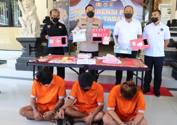 Kapolres Tabanan dalam keterangannya mengatakan Sat Resnarkoba Polres Tabanan kembali berhasil mengungkap 3 (tiga) Kasus penyalahgunaan Narkoba dan mengamankan 3 (tiga) orang pelaku salah satunya Perempuan beralamat di salah satu Desa di Kecamatan Penebel.