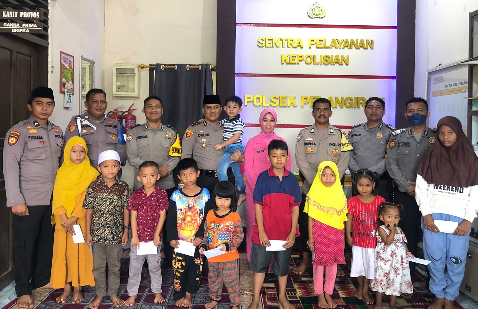Sebanyak 10 orang anak yatim dari Kelurahan Pelangiran hadir untuk mendapatkan santunan pada acara Silaturahmi dan Do'a yang digelar oleh Personil Polsek Pelangiran.