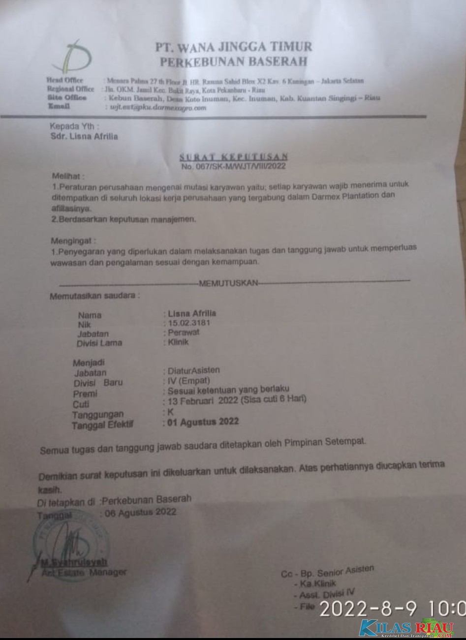 Perseroan Terbatas Wana Jingga Timur (PT. WJT) melakukan mutasi sepihak terhadap salah seorang karyawannya atas nama Lisna Aprilia yang awalnya dari tenaga kesehatan klinik dimutasi ke divisi kebun tanpa perundingan.