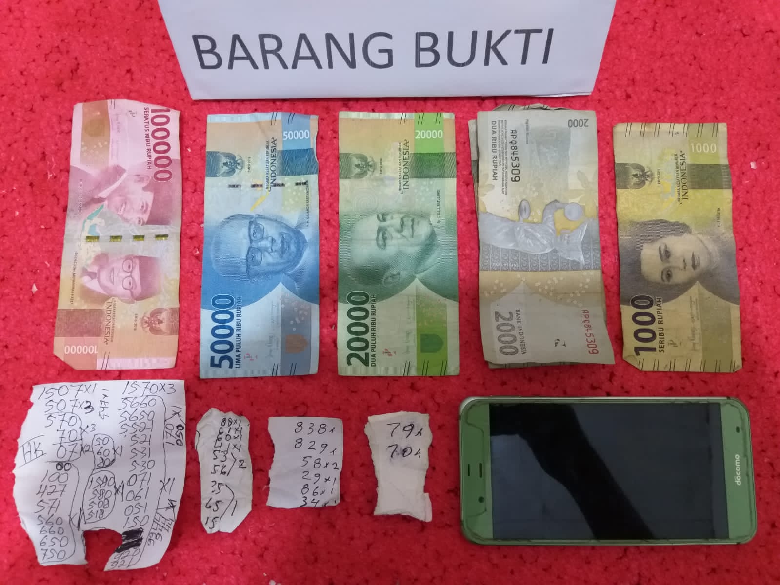 Satu unit handphone, uang ratusan ribu dan kertas bertuliskan nomor turut diamankan.