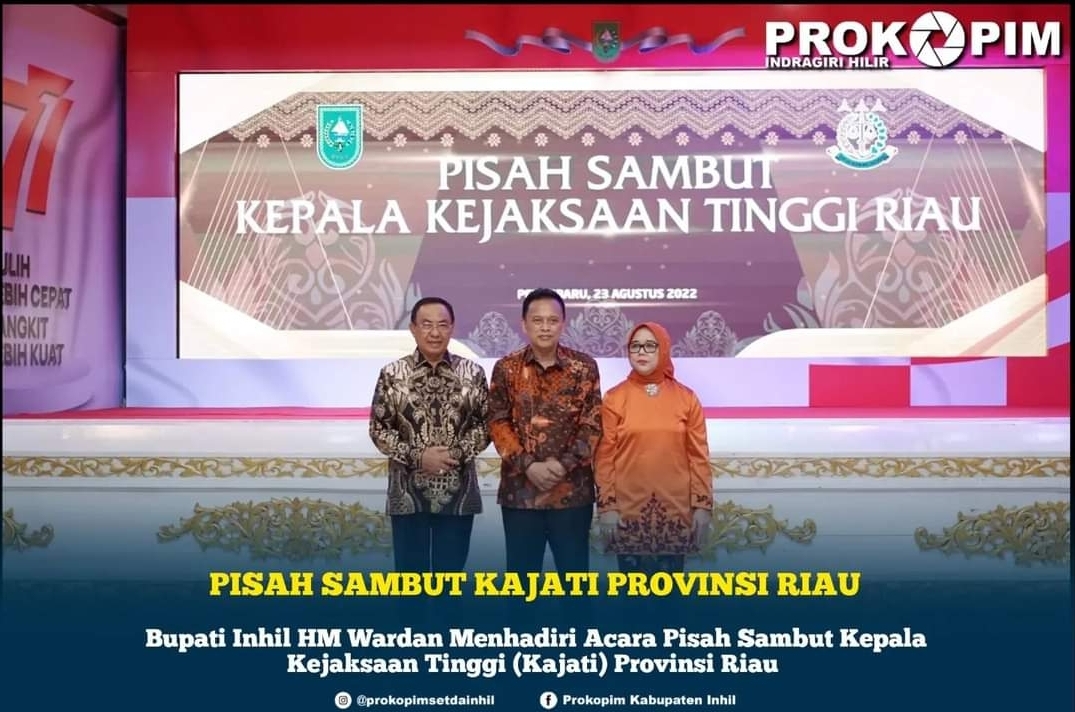 KILASRIAU.com - Bupati Indragiri Hilir Drs H. M Wardan menghadiri acara pisah sambut kepala kejaksaan Tinggi (kajati) Provinsi Riau dari Dr Jaja Subagja,SH,. MH kepada Supardi, bertempat di gedung daerah Balai Serindit, Pekanbaru. Selasa (23/8/2022) malam.