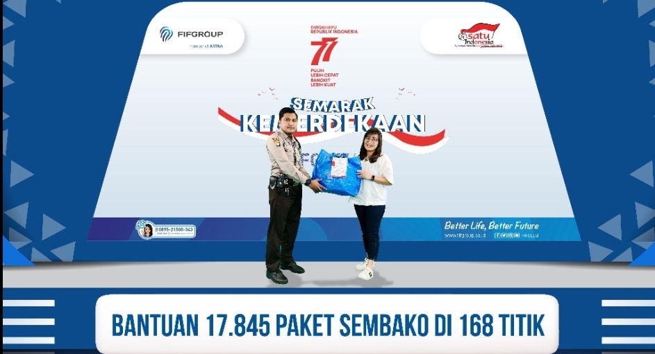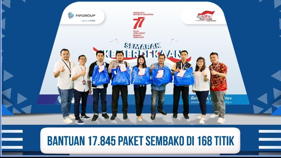 Sebagai salah satu anak perusahaan PT Astra International Tbk serta merupakan bagian dari Astra Financial, FIFGROUP, melalui program Corporate Social Responsibility (CSR) Peduli terus berupaya untuk tetap hadir di tengah-tengah masyarakat dengan memberikan bantuan sembako sebanyak 17.845 paket senilai Rp3,569 miliar, bagi masyarakat di sekitar 168 titik cabang FIFGROUP, yang akan diserahkan pada tanggal 23-28 Agustus 2022.