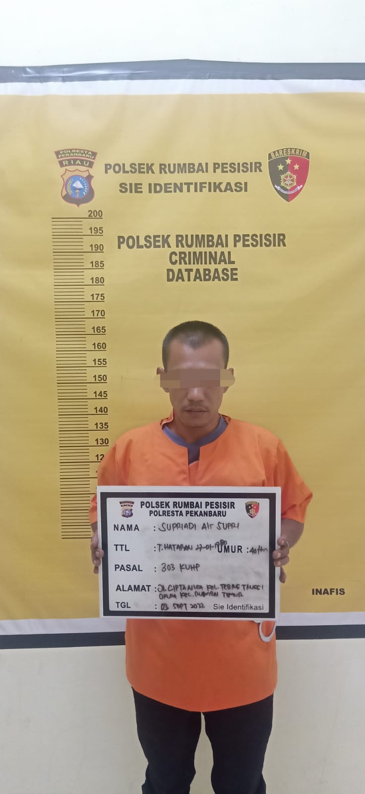 Kapolresta Pekanbaru Kombes Pol Dr Pria Budi SIK. MH melalui Kapolsek Rumbai Pesisir Kompol Febriandy. SH. SIK membenarkan adanya penangkapan diduga pelaku tindak pidana perjudian, untuk pelaku sendiri berinisial SI Umur 40 Tahun, Alamat tinggal Jl. Cipta Nusa RT 01 RW 01 Kelurahan Tebing Tinggi Okura Kec. Rumbai Kota Pekanbaru.
