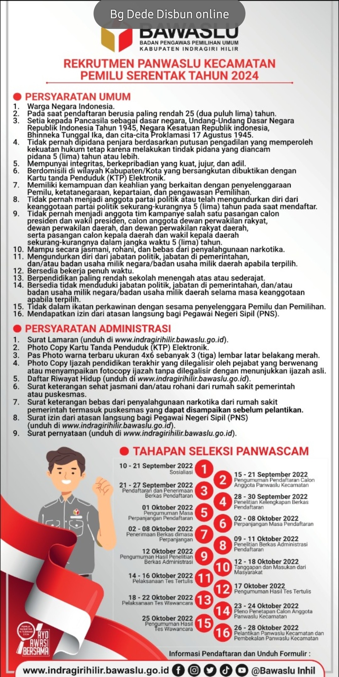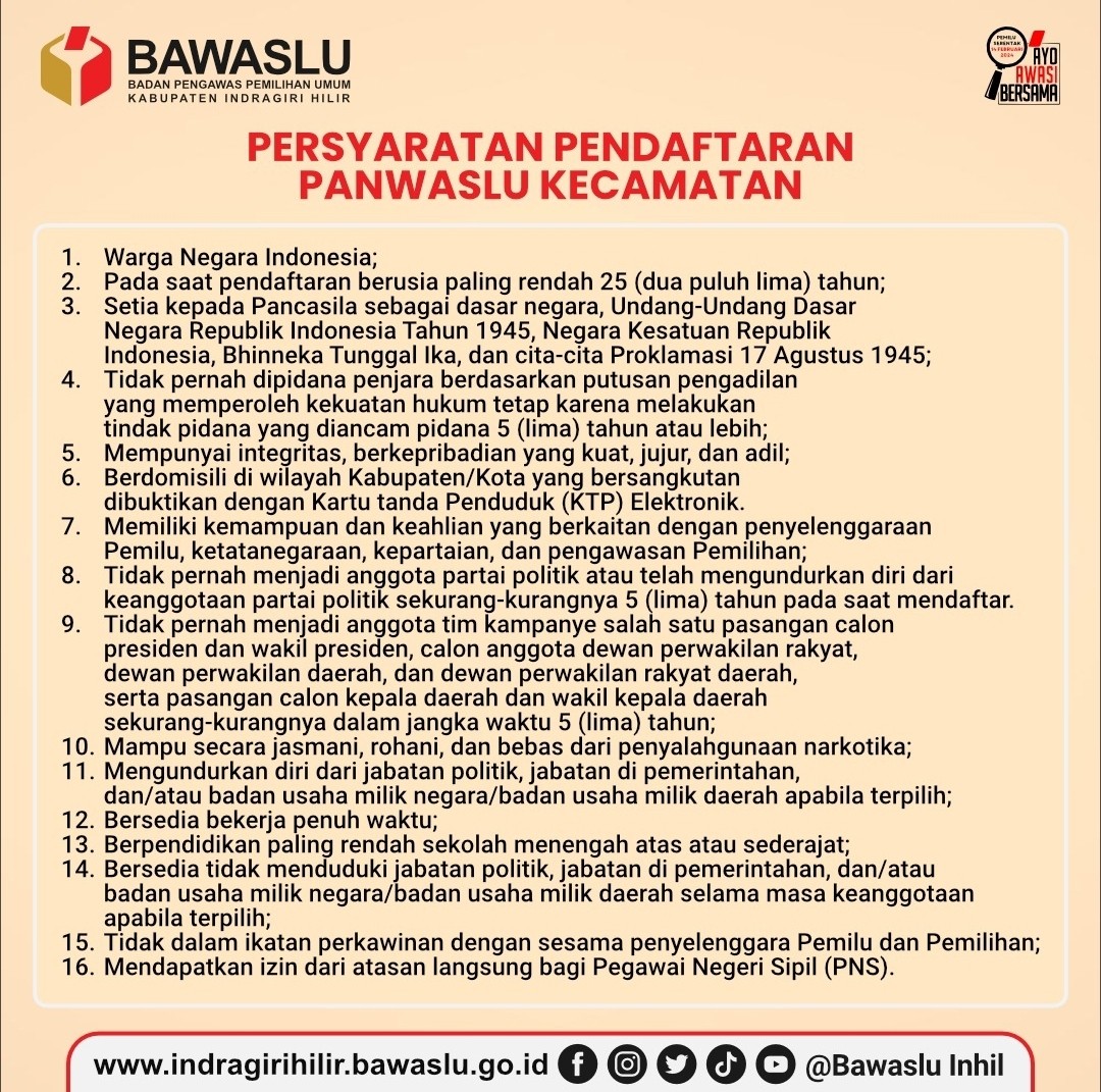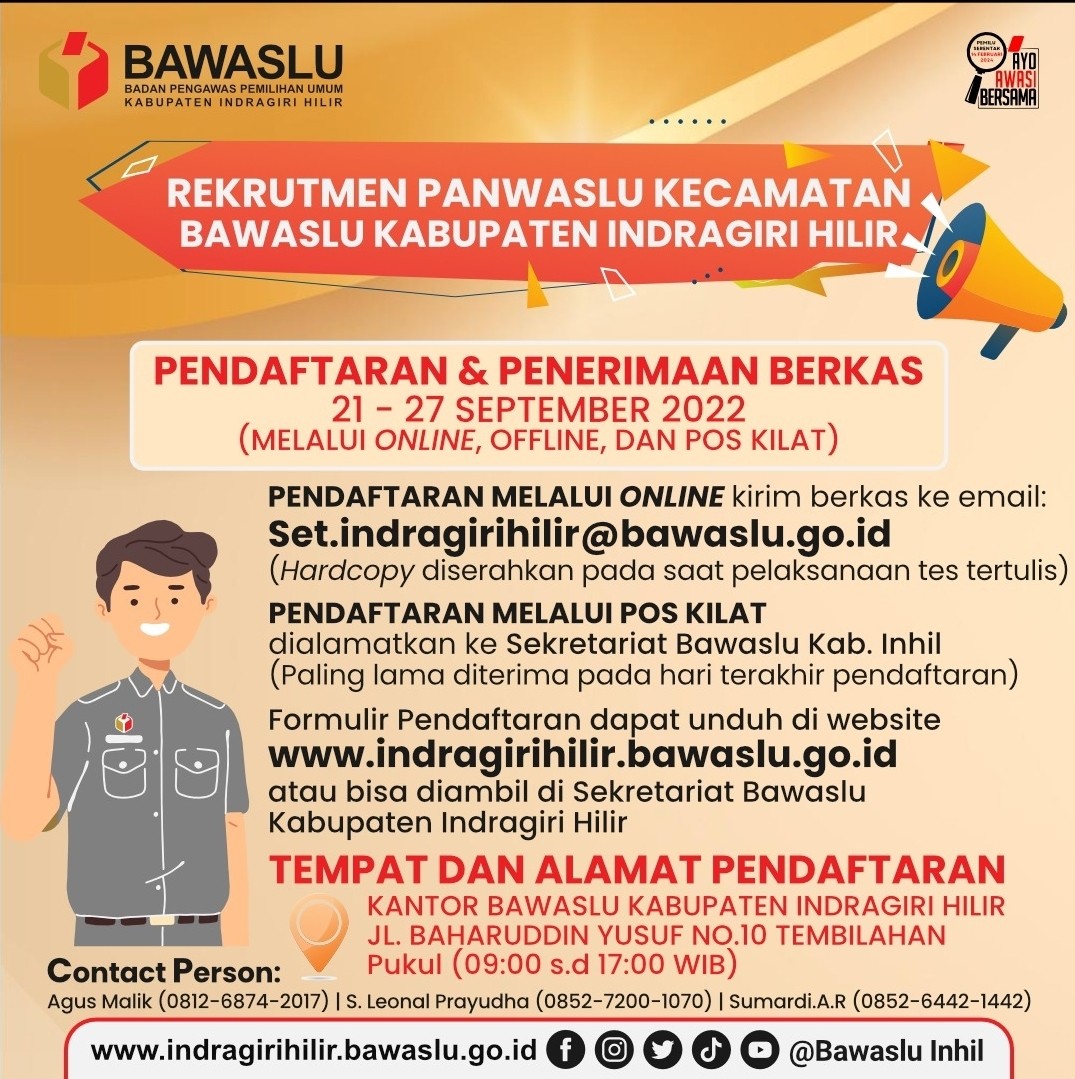 Untuk informasi lebih lanjut bisa langsung datang ke kantor Bawaslu Kabupaten Inhil atau melalui link yang telah disiapkan yaitu https://indragirihilir.bawaslu.go.id/wp-content/uploads/2022/09/1.-PENGUMUMAN-PANWASCAM.pdf