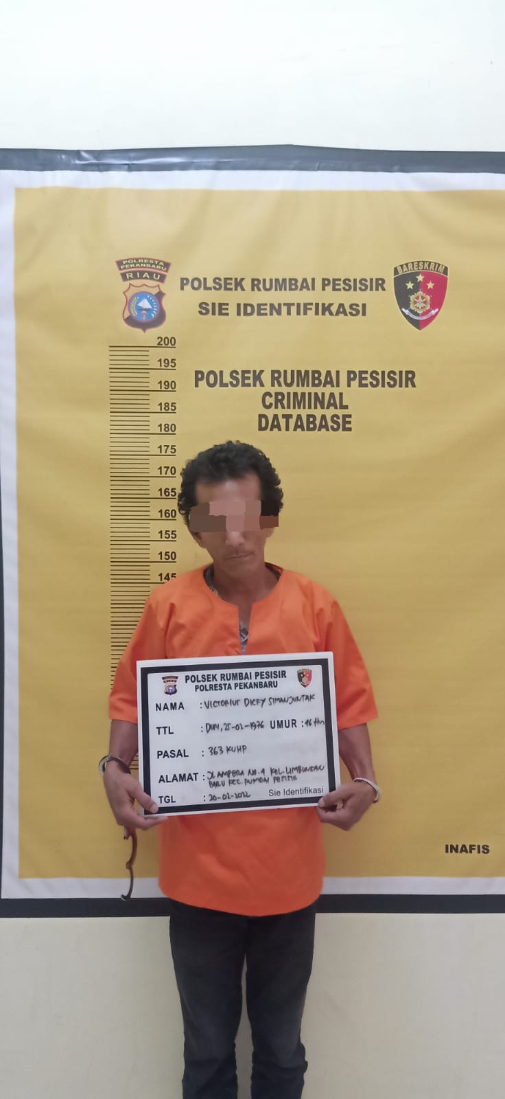 "Pada hari Selasa 20 September 2022 sekira pukul 10.00 Wib anggota Reskrim Polsek Rumbai Pesisir mendapat informasi keberadaan satu pelaku dugaan tindak pidana pencurian dengan pemberatan (Curat) berada di salah satu warnet di Jalan Khayangan, Kelurahan Limbungan Baru Kecamatan Rumbai, Kota Pekanbaru," ujar Kapolsek Pekanbaru.