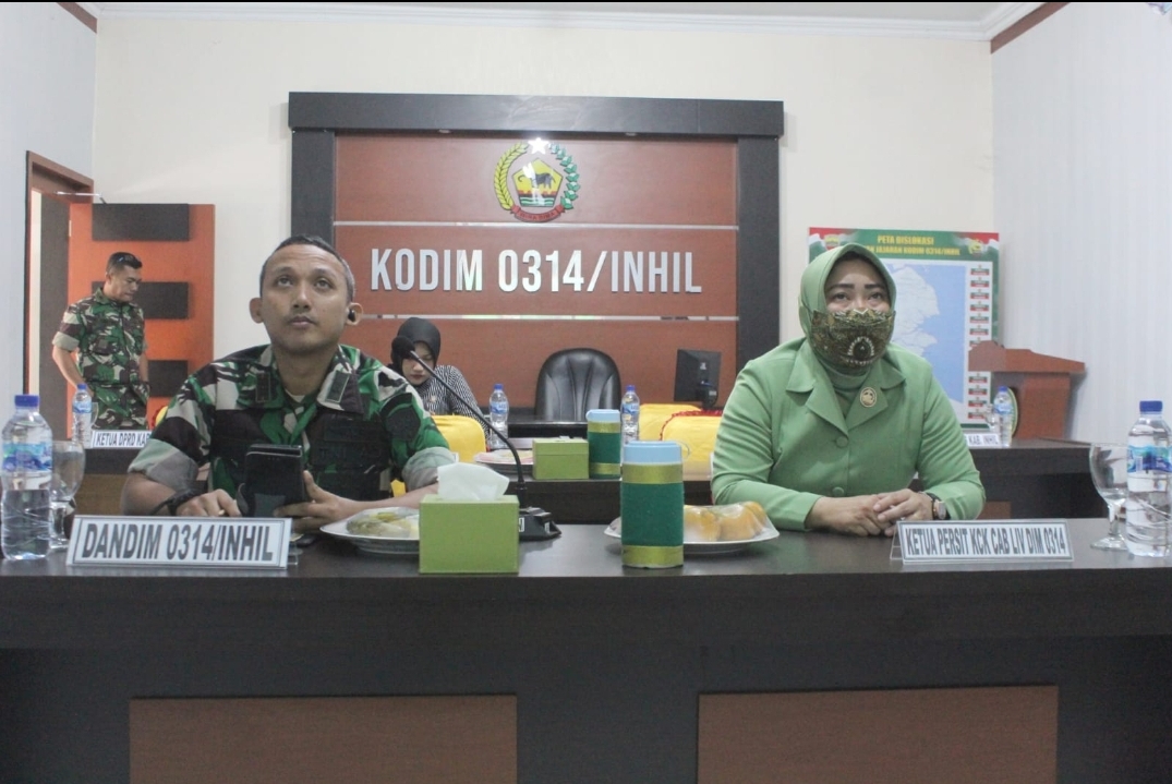 KILASRIAU.com - Dandim Inhil dan Ketua Persit Kartika Chandra Kirana Cababang LIV Dim 0314/Inhil mengikuti acara vidcon Pengukuhan Danrem 031/Wirabima dan ketua persis KCK koorcab Rem 031 PD I BB sebagai bapak asuh dan bunda asuh anak stunting (BAAS) 2022, Jum'at (30/09/22).