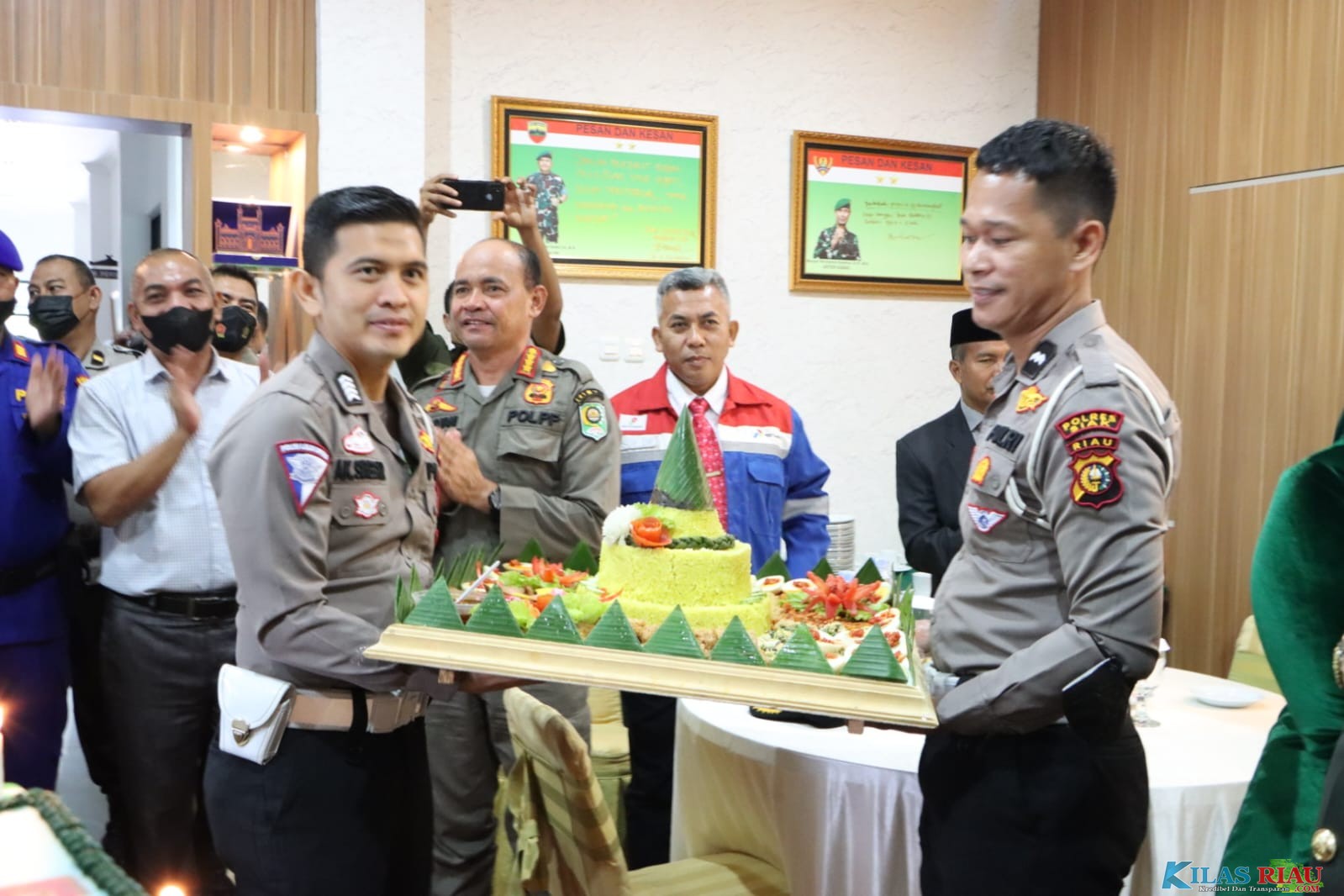 Terlihat Wakapolres Siak bersama beberapa personil Polres Siak masuk melalui pintu samping kantor Makodim membawa Kue ulang tahun dan nasi tumpeng yang langsung diberikan Kapolres Siak kepada Dandim 0322/Siak Letkol Inf Muhammad Faisal Effendi.