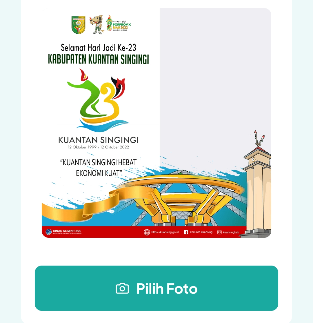TELUK KUANTAN — Masyarakat Kuantan Singingi, yuk semarakkan Hari Ulang Tahun (HUT) atau Hari Jadi Kabupaten Kuantan Singingi (Kuansing) ke-23 pada 12 Oktober 2022 dengan memasang bingkai foto twibbon untuk diunggah di media sosial masing-masing.