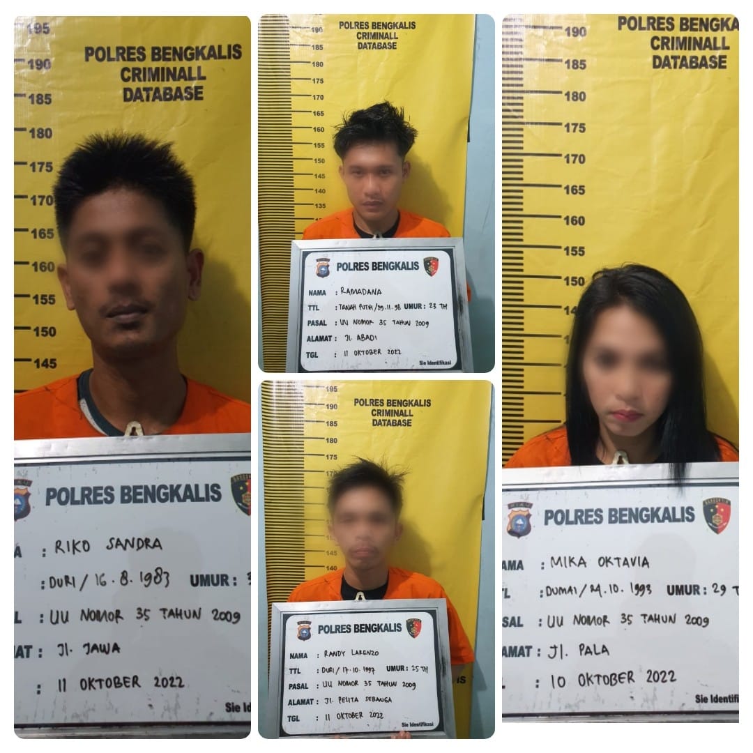 Dalam perburuan itu, empat pelaku diamankan diantaranya berinisial MO alias Ika (29), Perempuan, warga Jalan Pala, Kelurahan Air Jamban, Kecamatan Mandau, Bengkalis, RS alias Cekot (39), warga Jalan Jawa, Kelurahan Gajah Sakti, Kecamatan Mandau, Bengkalis, R (23) warga Jalan Abadi, Desa Tambusai Batang Dui, Kecamatan Bathin Solapan, Bengkalis dan RL (25) warga Jalan Pelita, Kelurahan Titian Antui, Kecamatan Pinggir, Bengkalis.