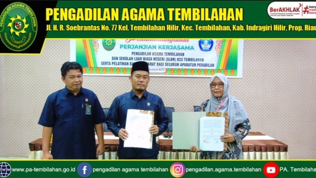 KILASRIAU.com - Bertempat di Aula Pengadilan Agama Tembilahan Jalan H.R. Soebrantas Nomor 77 Tembilahan, PA Tembilahan melakukan penandatanganan perjanjian kerja sama dengan Sekolah Luar Biasa Negeri (SLB N) 033 Tembilahan terkait penyediaan layanan akomodasi yang layak bagi penyandang disabilitas serta pelatihan bahasa isyarat kepada seluruh aparatur Pengadilan Agama Tembilahan.