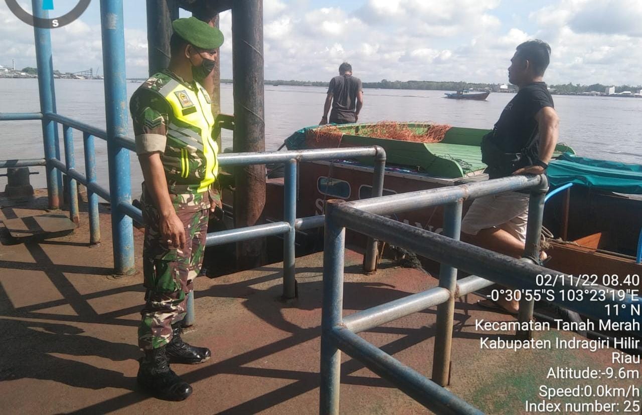 Kilasriau.com - Sertu HM Sibarani anggota Koramil 02/Tanah Merah, jajaran Kodim 0314/Inhil melaksanakan tugas himbauan protokol kesehatan Protkes kepada masyarakat yang ada di pelabuhan Kelurahan Kuala Enok, kecamatan Tanah Merah, kabupaten Indragiri Hilir, Rabu (2/11/22)
