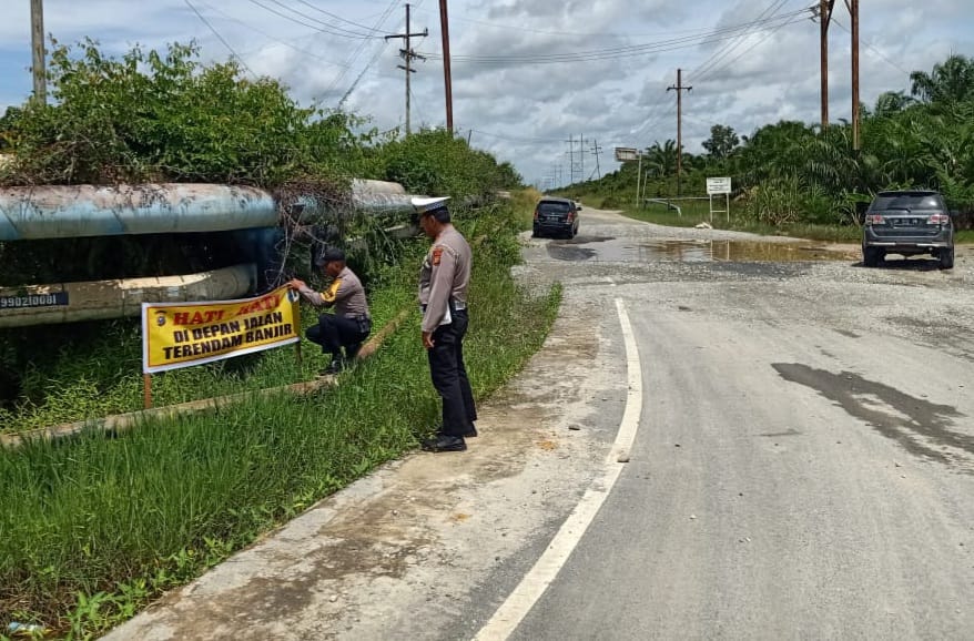 Kanit lantas Bungaraya Ipda Ridwan dibantu personil Bhabinkamtibmas setempat turun lansung memasang spanduk himbauan dititik titik rawan banjir. Selasa pagi ( 08/11/2022 ).