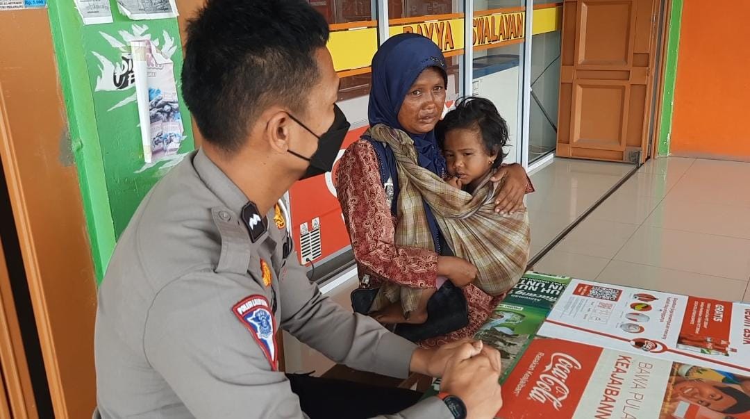 “Personil yang merasa kasihan dengan ibu tersebut menghentikan kendaraan nya dan langsung menghampiri Ibu Dewi ini dan Anak nya”. terang Viola