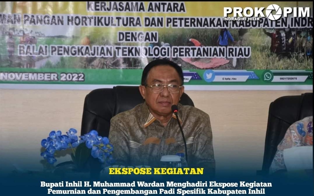KILASRIAU.com - Bupati Indragiri Hilir H. M. Wardan didampingi Kadis Tananaman Pangan Holtikultura dan Peternakan Kab. Inhil serta jajaran terkait menghadiri ekspose kegiatan pemurnian dan pengembangan padi spesifik Kab. Inhil yang dilaksanakan di aula Kantor BPTP Pekanbaru, Sabtu (19/11/11)