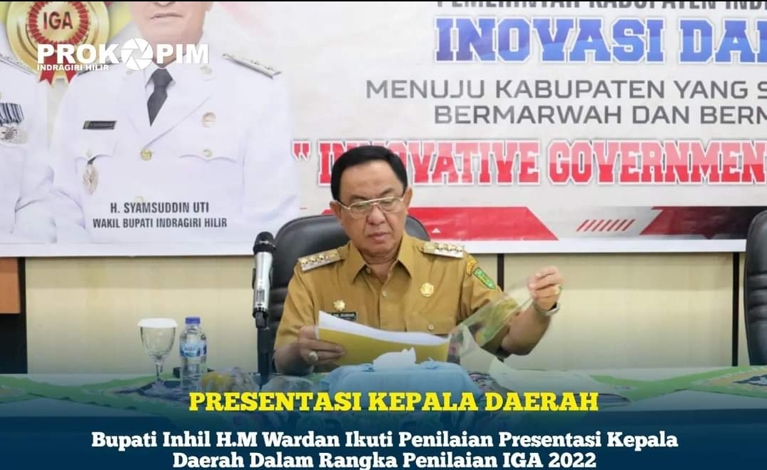 KILASRIAU.com - Tim Penilaian Inovatif Government Award (IGA ) diselenggarakan oleh Badan Penelitian dan Pengembangan (Litbang) Kementerian Dalam Negeri (Kemendagri) RI melalui virtual meeting. Presentasi tersebut diikuti kepala daerah inovatif kategori Provinsi dan Kabupaten yang diantaranya Bupati Kabupaten Indragiri Hilir Drs. H.M Wardan, MP, di Aula Kantor Bappeda Indragiri Hilir, Tembilahan, Senen, (21/11/22).