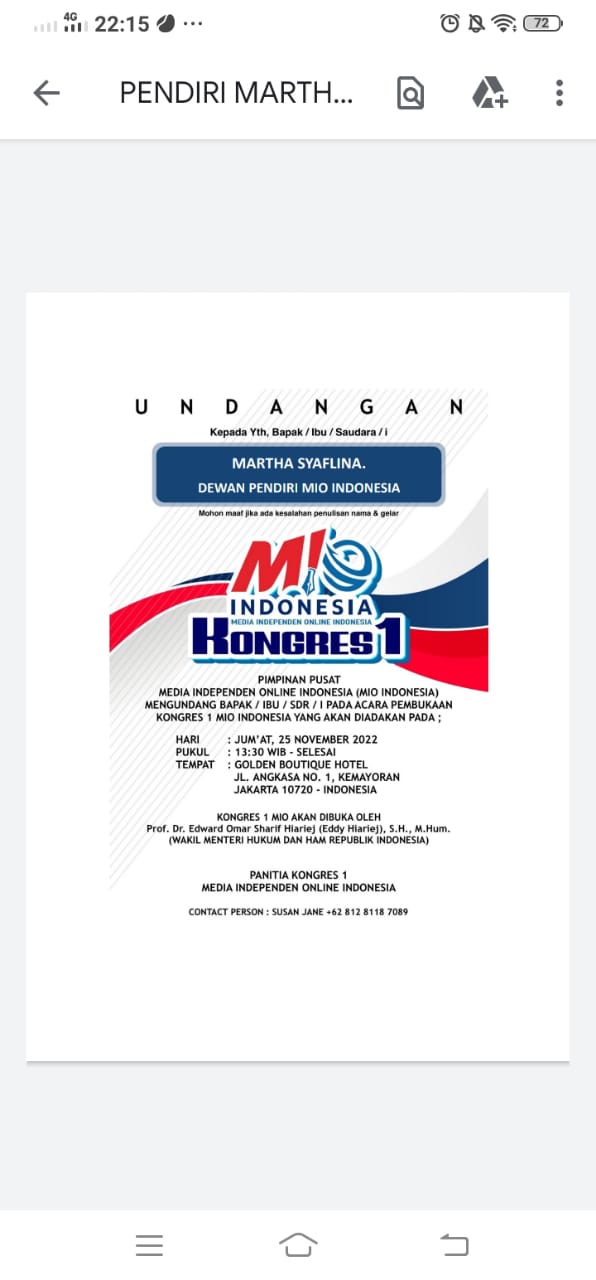 KILASRIAU.com, Jakarta, - Isu untuk mengadakan Kongres 1 MIO Indonesia akhirnya menjadi kenyataan juga setelah surat undangan dibagi-bagikan kepada beberapa pendiri dan pengurus organisasi tersebut. Salah satu yang mendapatkan surat undangan adalah pendiri MIO Indonesia Martha Syaflina, S.E. sekaligus Direktur Utama PT MZK Grup, Jum'at (25/11/2022). Surat tersebut diterima Martha Jum'at pagi, saat itu dirinya berada di Yogyakarta setelah pindah rumah awal tahun 2022.
