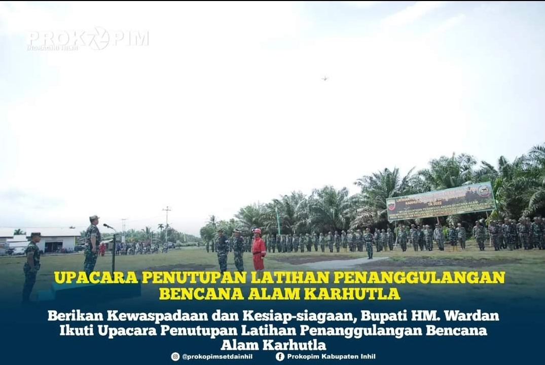 Upacara penutupan latihan bencana alam Korem 031/WB yang di laksanakan dalam wilayah Kodim 0314 ini, di pimpin oleh Danrem Wiirabima yang diwakili oleh Kasrem 031 Wira Bima Kolonel Inf Habzen Sianturi SIP MM, turut di hadiri PJU Korem 031 Wirabima, Unsur Forkopimda Inhil, pimpinan perusahaan PT Sinar Mas, Kepala OPD terkait, Camat Enok dan para peserta latihan.