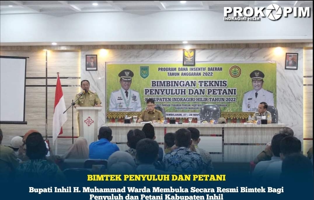 KILASRIAU.COM - Bupati Indragiri Hilir (Inhil) Drs. H. Muhammad Wardan, MP membuka secara resmi kegiatan Bimbingan Teknis (Bimtek) bagi Penyuluh dan Petani Kabupaten Inhil disalah satu Hotel yang ada di Tembilahan, Senin (28/11/22).