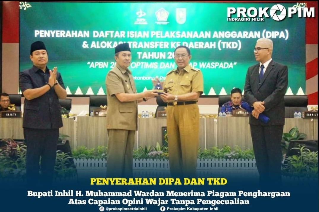 Dokumen tersebut diterima langsung oleh Bupati Inhil Drs. HM Wardan MP dari Gubernur Riau (Gubri) H. Syamsuar dan Kakanwil DJPB Riau, bertempat di Balai Pauh Janggi Gubernuran, Pekanbaru, senin (05/12/2022).