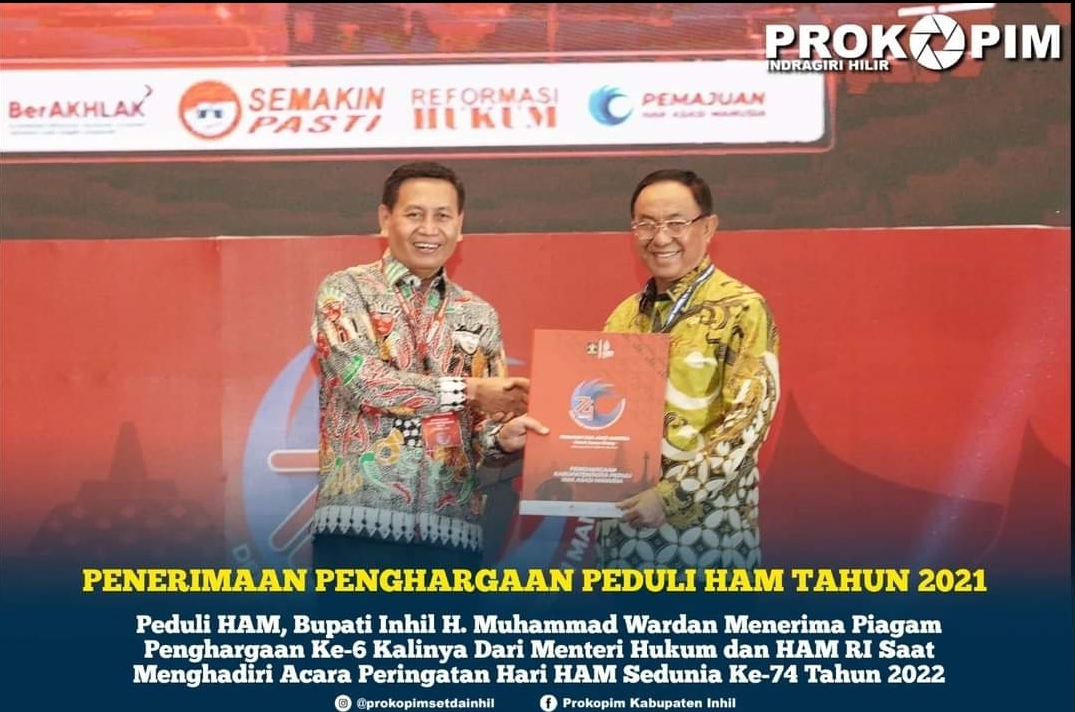 Piagam penghargaan ini diserahkan oleh Dirjen HAM Dr. Mualimin Abdi dan diterima langsung oleh Bupati Inhil H. Muhammad Wardan saat menghadiri acara Peringatan Hari HAM sedunia ke-74 tahun 2022 di Golden Ballroom Hotel Sultan Jakarta.