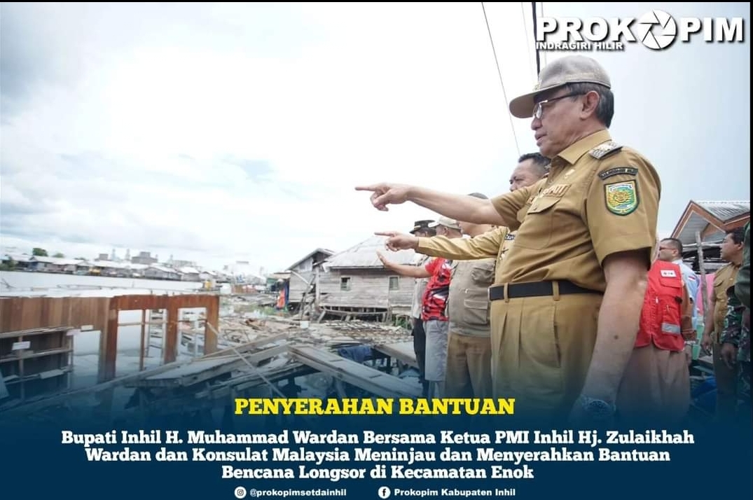 Kilasriau.com - Sebagai bentuk Kepedulian Pemerintah Kepada Masyarakat yang sedang terkena musibah, Bupati Inhil HM WARDAN bersama Ketua PMI Inhil Hj. Zulaikhah Wardan didampingi Konsul Malaysia Pekanbaru, Wan Nurshima Wan Jusoh meninjau secara langsung dan serahkan bantuan kepada korban bencana longsor di Kelurahan Kuala Enok, Kecamatan Tanah Merah, selasa (13/12/22).
