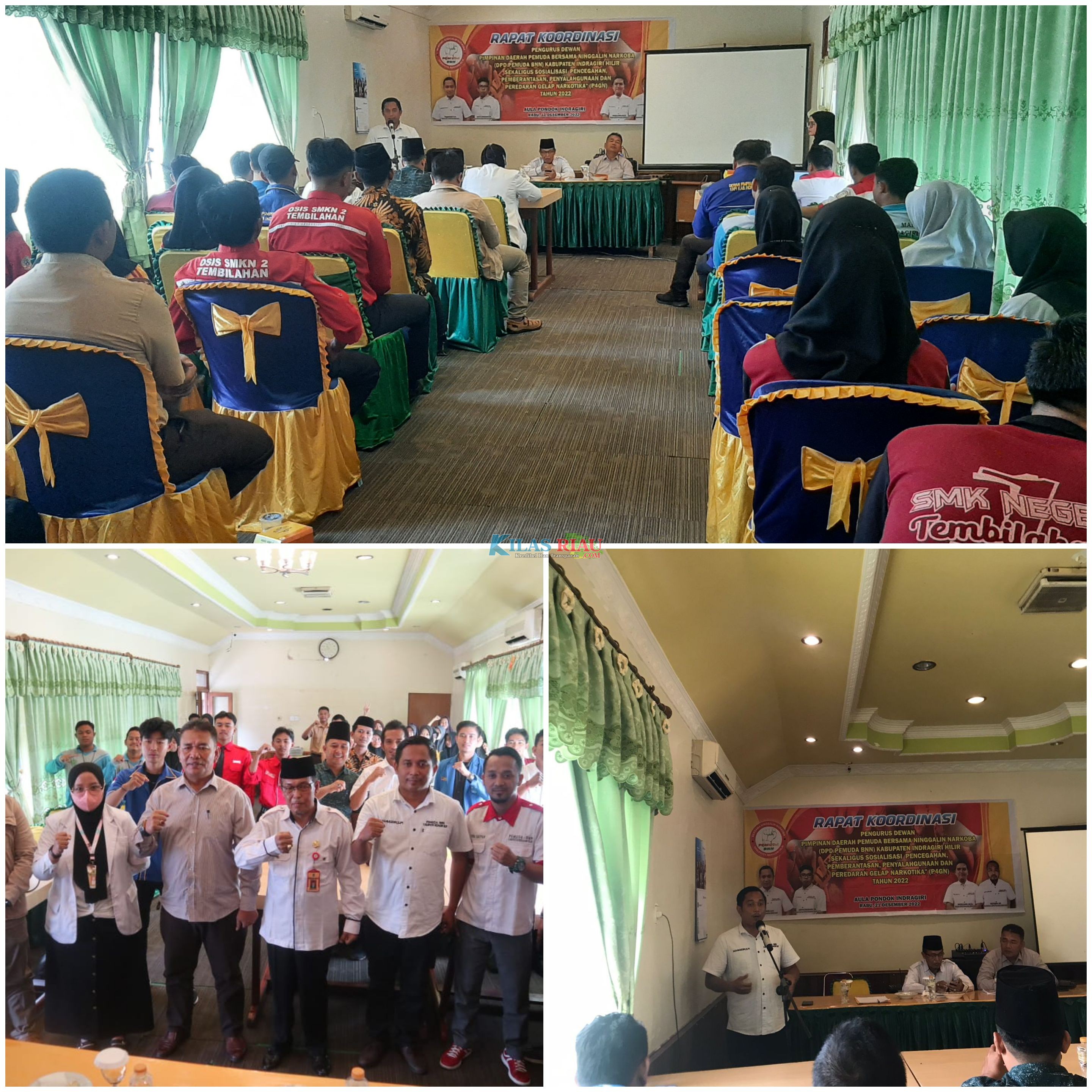 KILASRIAU.COM - Bertempat Aula Pondok Indragiri, Dewan Pengurus Daerah (DPD) Pemuda Bersama Ninggalin Narkoba (BNN) Kabupaten Indragiri Hilir (Inhil), menyelenggarakan Rapat Kordinasi DPD Pemuda BNN Kab. Indragiri Hilir sekaligus Sosialisasi Pencegahan, Pemberantasan, Penyalahgunaan, dan Peredaran Gelap Narkotika (P4GN) 2022, Rabu (21/12/22).