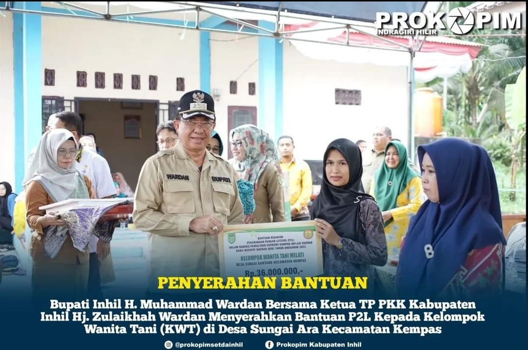KILASRIAU.com - Bupati Kabupaten Indragiri Hilir (Inhil) Drs. HM. Wardan didampingi Ketua TP-PKK Hj. Zulaikhah Wardan serta Ketua Komisi II DPRD Inhil dan beberapa kepala OPD terkait, menyerahkan secara simbolis bantuan P2L kepada Kelompok Wanita Tani, bertempat di Aula Balai Desa Sungai Ara, Kecamatan Kempas, Selasa (27/12/2022).