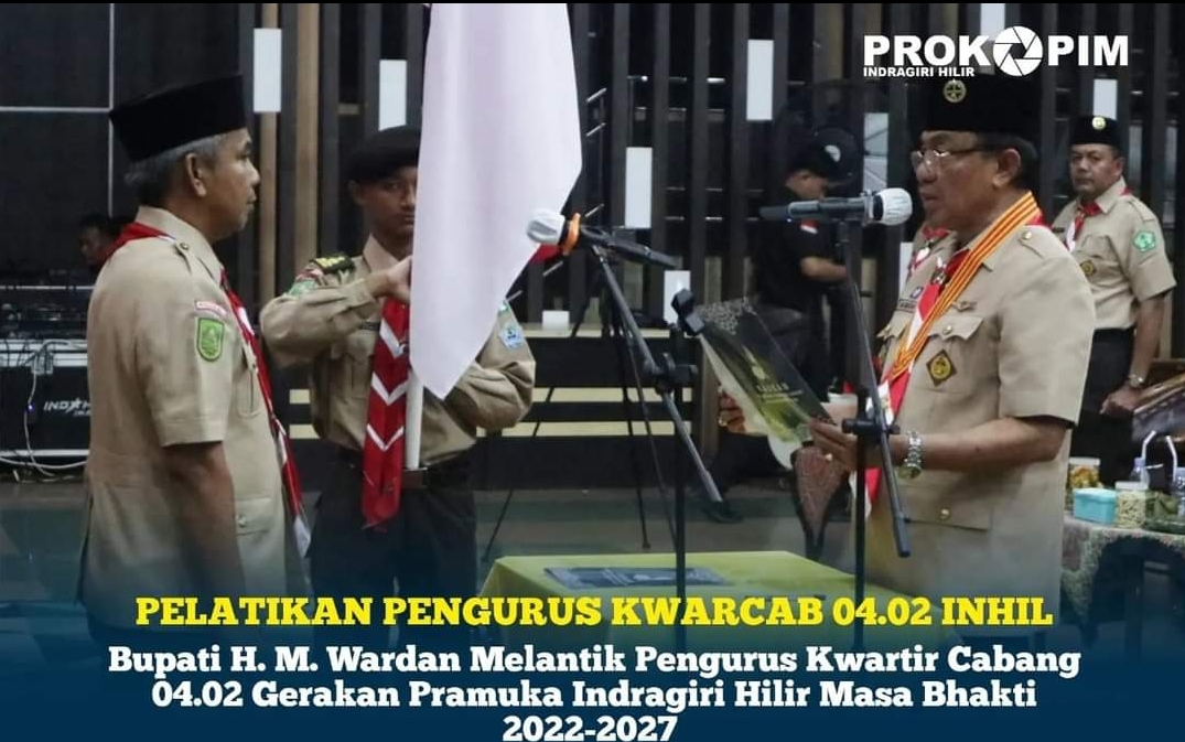 Ketua Kwartir Cabang (Kwa 04.02 gerakan Pramuka Indragiri Hilir Periode 2022-2027 Junaidi, S. Sos, M. Si dan kawan-kawan di lantik langsung oleh Bupati Indragiri Hilir selaku ketua Majelis Pembimbing Cabang 04.02 gerakan pramuka Indragiri Hilir HM. Wardan.