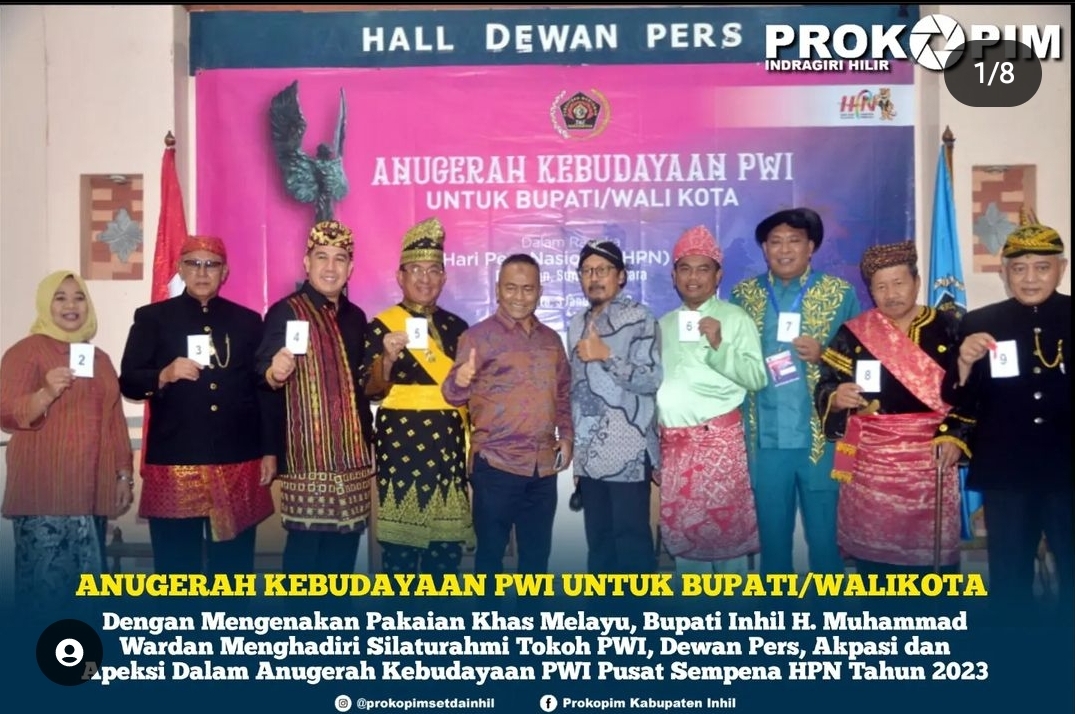 Mengenakan pakaian adat khas melayu Bupati Indragiri Hilir H. M. Wardan dengan didampingi Kepala Bapeda, Kadis Perkebunan, Kadis Parporabud, Kadis Kominfopersantik, Kadis Pendidikan, Kadis Perindag dan Kadis DLHK serta PWI Kab. Inhil menghadiri silaturahmi tokoh PWI, Dewan Pers, Akpasi dan Apeksi bersama 10 nominator sekaligus pencabutan nomor urut peserta presentasi Anugerah Kebudayaan PWI Pusat dalam rangka Hari Pers Nasional (HPN) 2023 yang dilaksanakan di Hall Dewan Pers Kantor PWI Pusat di Jakarta, Selasa (03/01/2022).