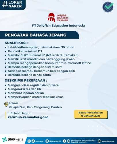 Untuk itu, jangan khawatir bagi para pemburu lowongan kerja (Loker), kini PT Jellyfish Education Indonesia membuka kesempatan bagimu untuk mengisi formasi yang tersedia.