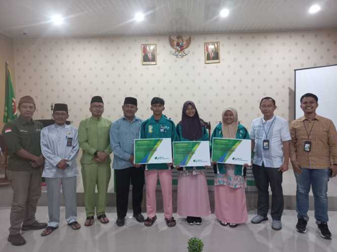 Penyerahan Simbolis Kartu Peserta BPJS Ketenagakerjaan dilakukan langsung oleh Kepala BPJS Ketenagakerjaan Batam Sekupang, Seto Tjahjono didampingi Panitia Kontingen yang juga Kepala Sekai Madrasah Kemenag Batam, Andika Setiawan di sela-sela acara pembekalan dan persiapan serta pelepasan 41 orang kontingen asal Provinsi Kepulauan Riau, di aula Fauzi Mahbub, Kantor Kementerian Agama (Kemenag) Kota Batam, Jumat (13/01/2023).